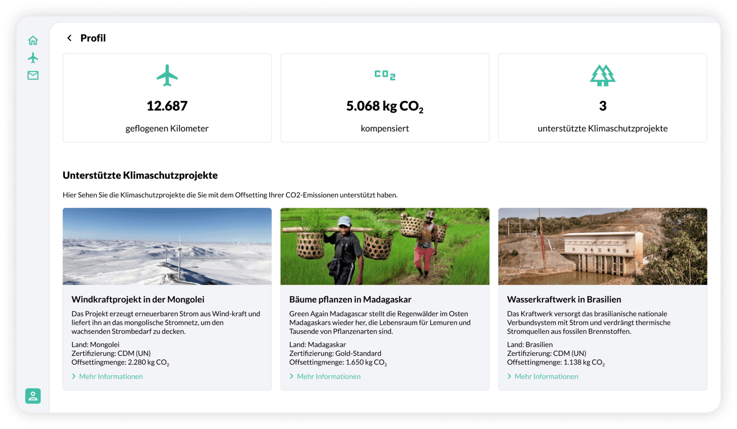 Zeigen Sie umfangreiche Informationen zu den gewählten Kompensationsprojekten an. So können Sie Ihren Kunden zeigen, wie genau ihre Kompensationen wirken und welche Projekte sie unterstützen.